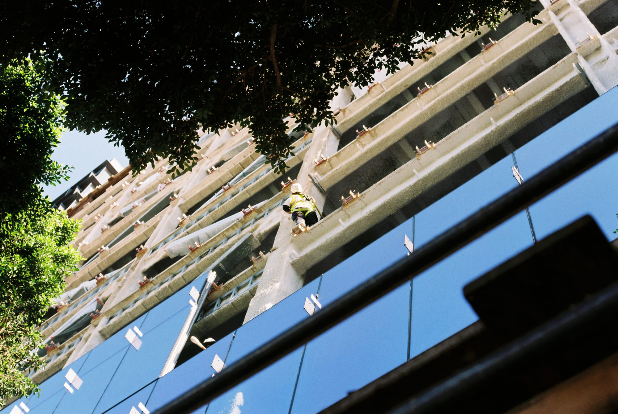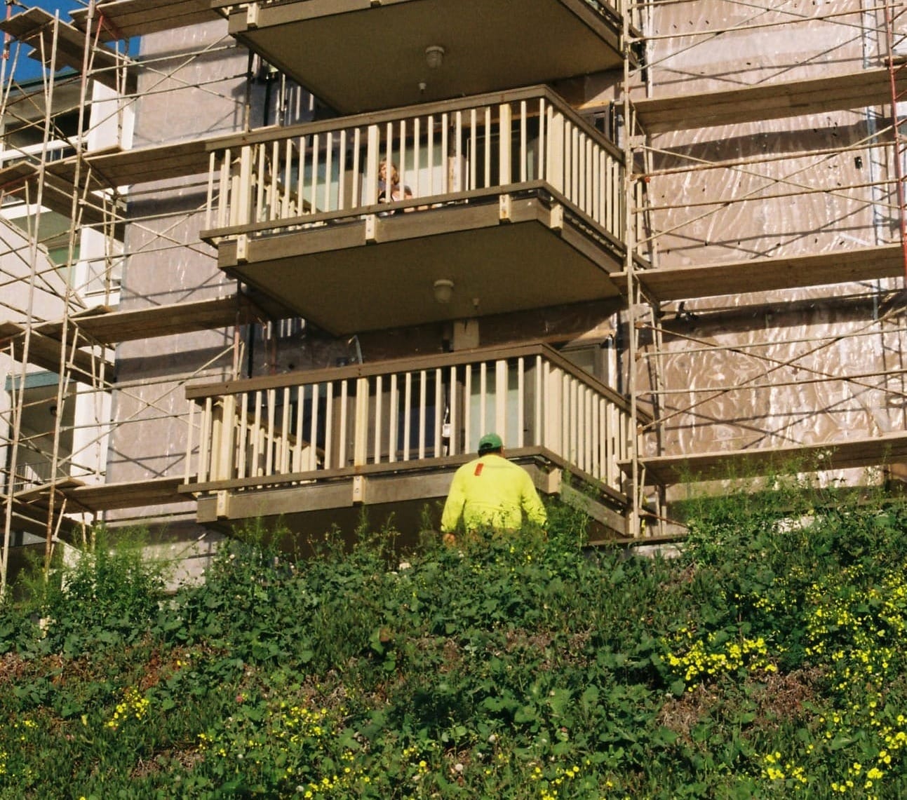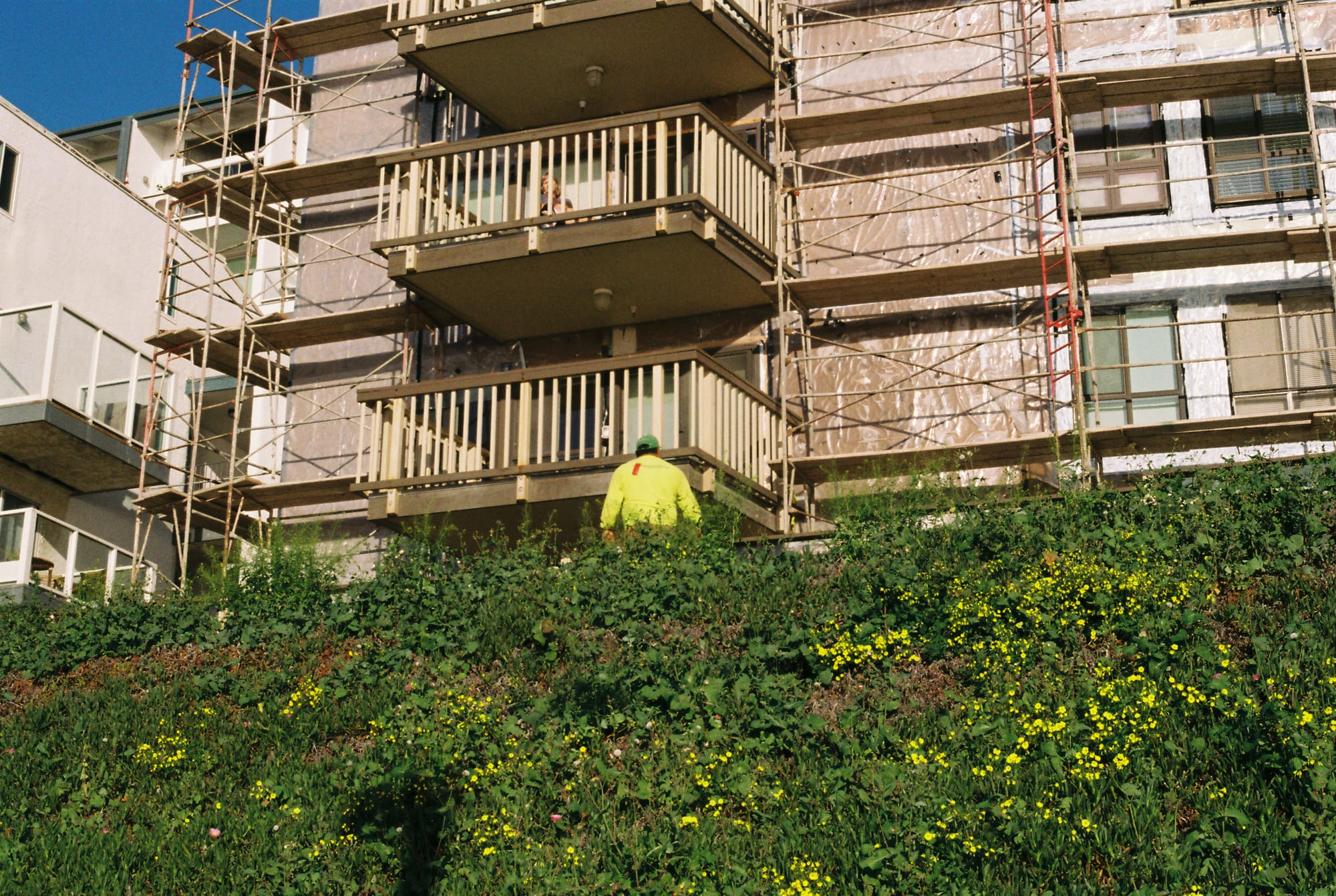 Similarly to the first construction photo I took, I wanted to take this because I liked the juxtaposition of man-made textures and nature. There's the added bonus here that the construction worker's clothes almost match the colors of the hill. I didn't notice until later that there was a woman on the balcony above talking to him, and that her clothes sort of match the building. If I had noticed her sooner I might've shot this with her in mind.