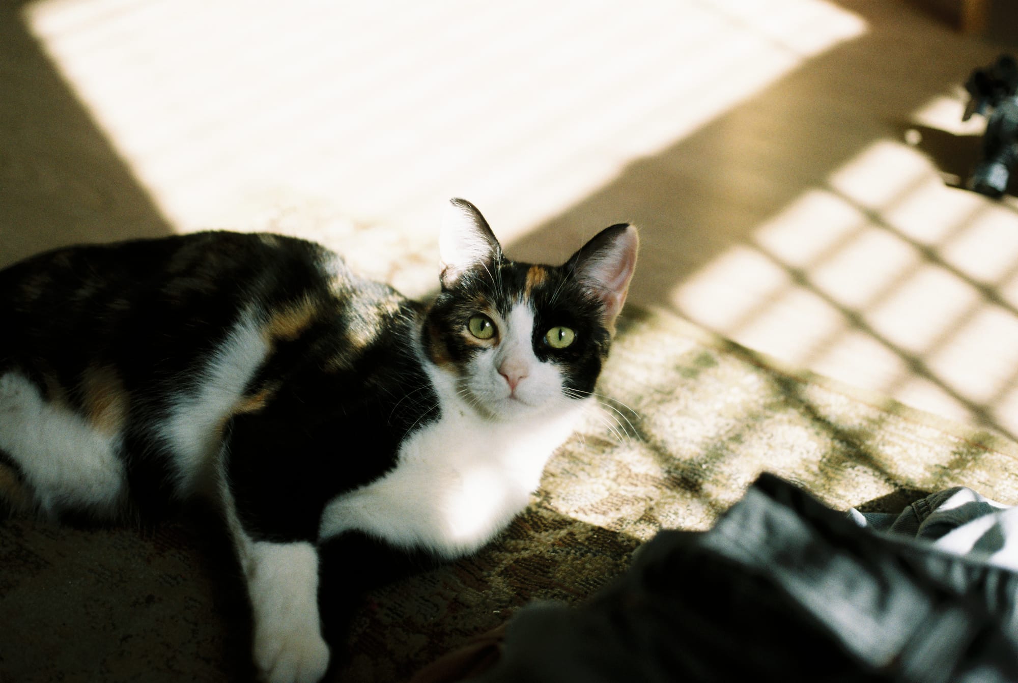 My roommate and I found the most perfect cat sitting in the sun at a shelter, and my roommate adopted her that week. She named her Simon. This is her lying in the sun on my rug.