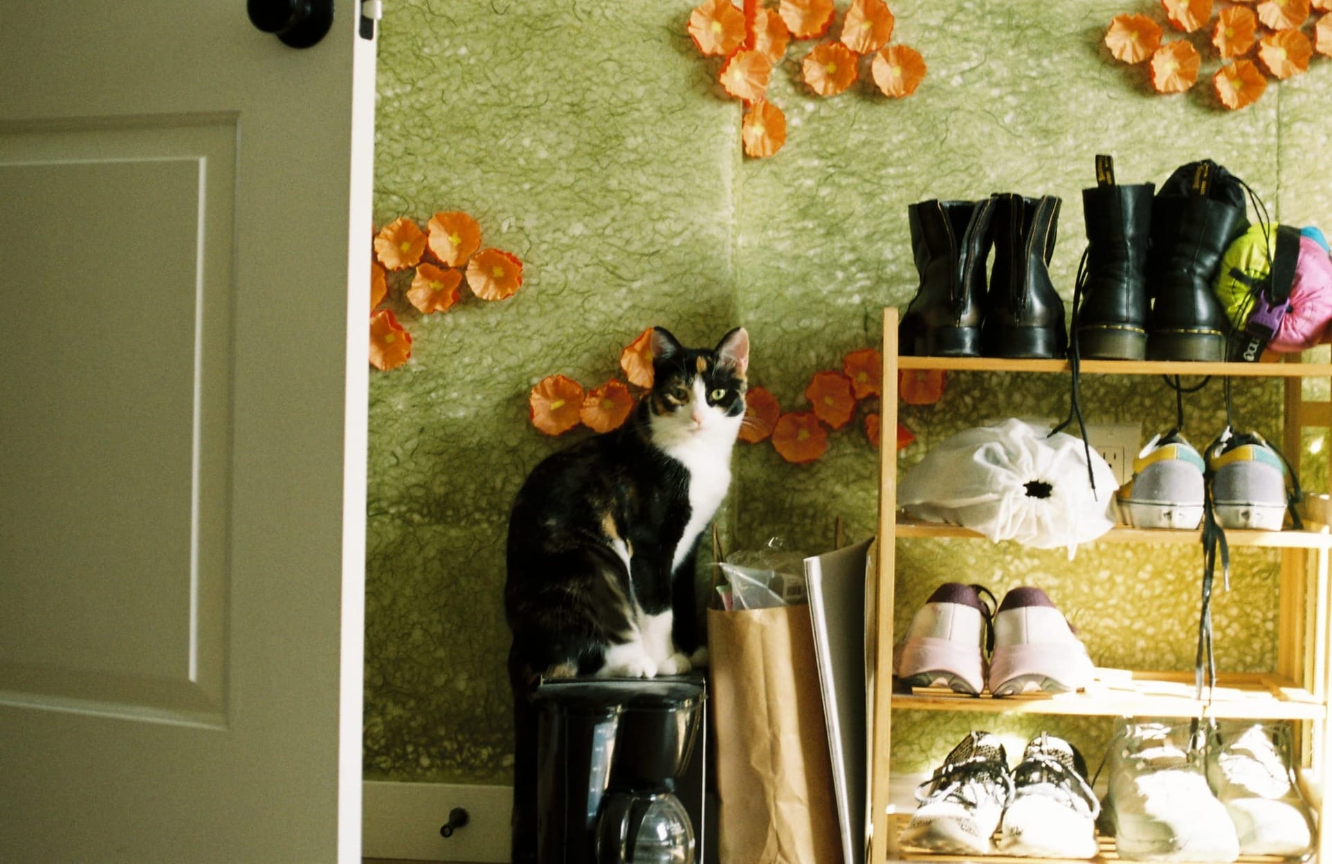 After a few days of being purely adorable, Simon started to become a bit of a menace. She's seen here perched on a box prior to ripping all the paper flowers off my wall. I've since replaced the flowers with wallpaper.