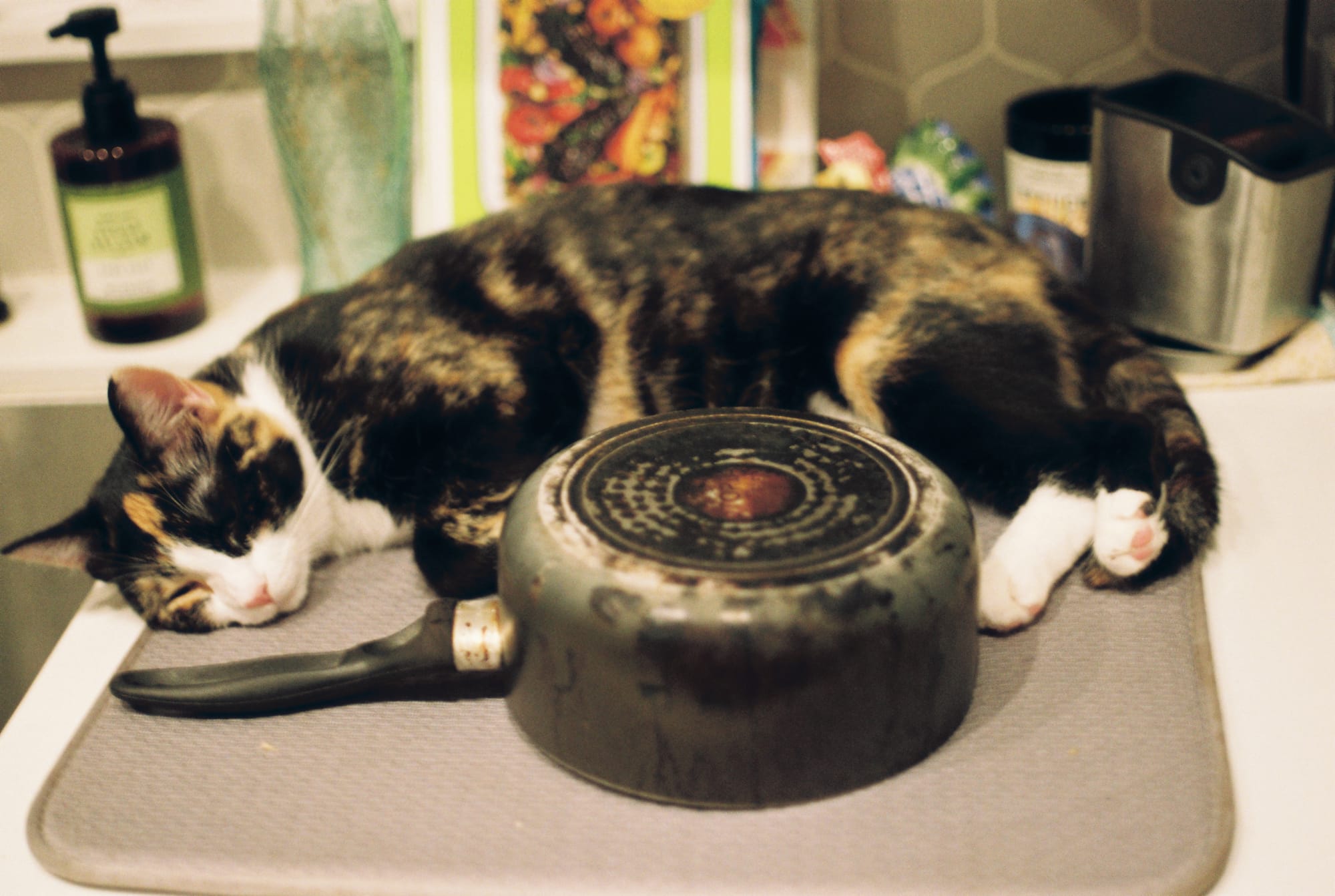 In addition to tearing apart and semi-ingesting all paper products, Simon also loves to watch us wash dishes. When I took this photo, she had fallen asleep after staring at the sink for a while.