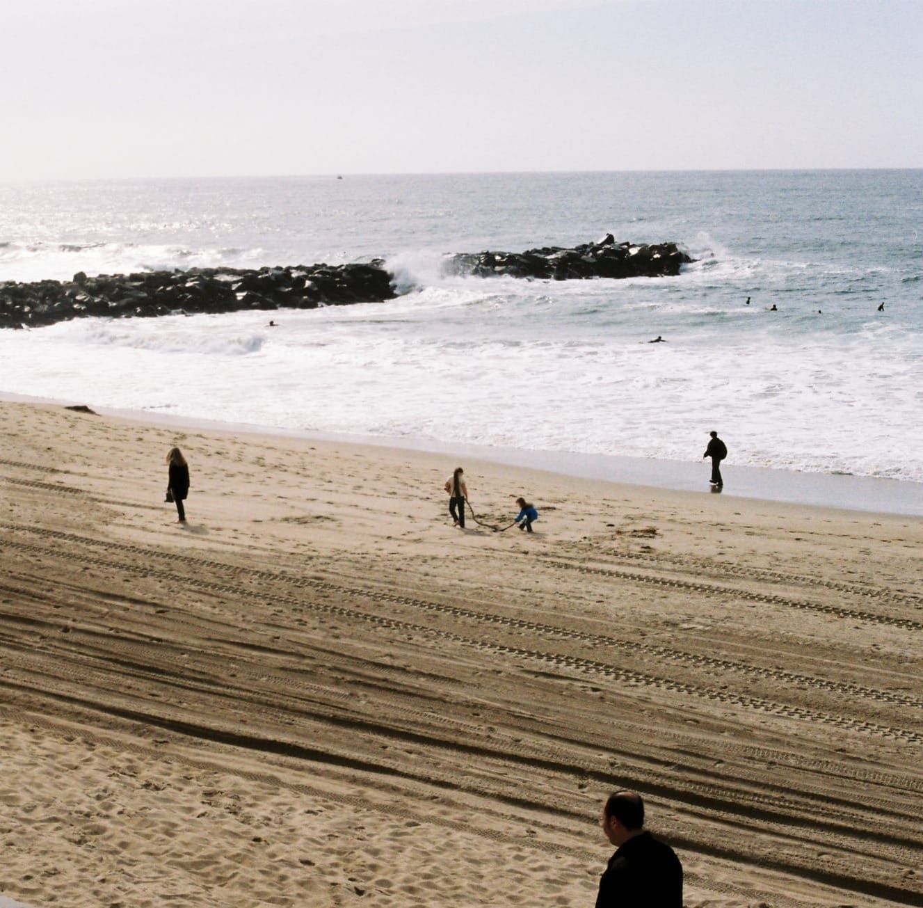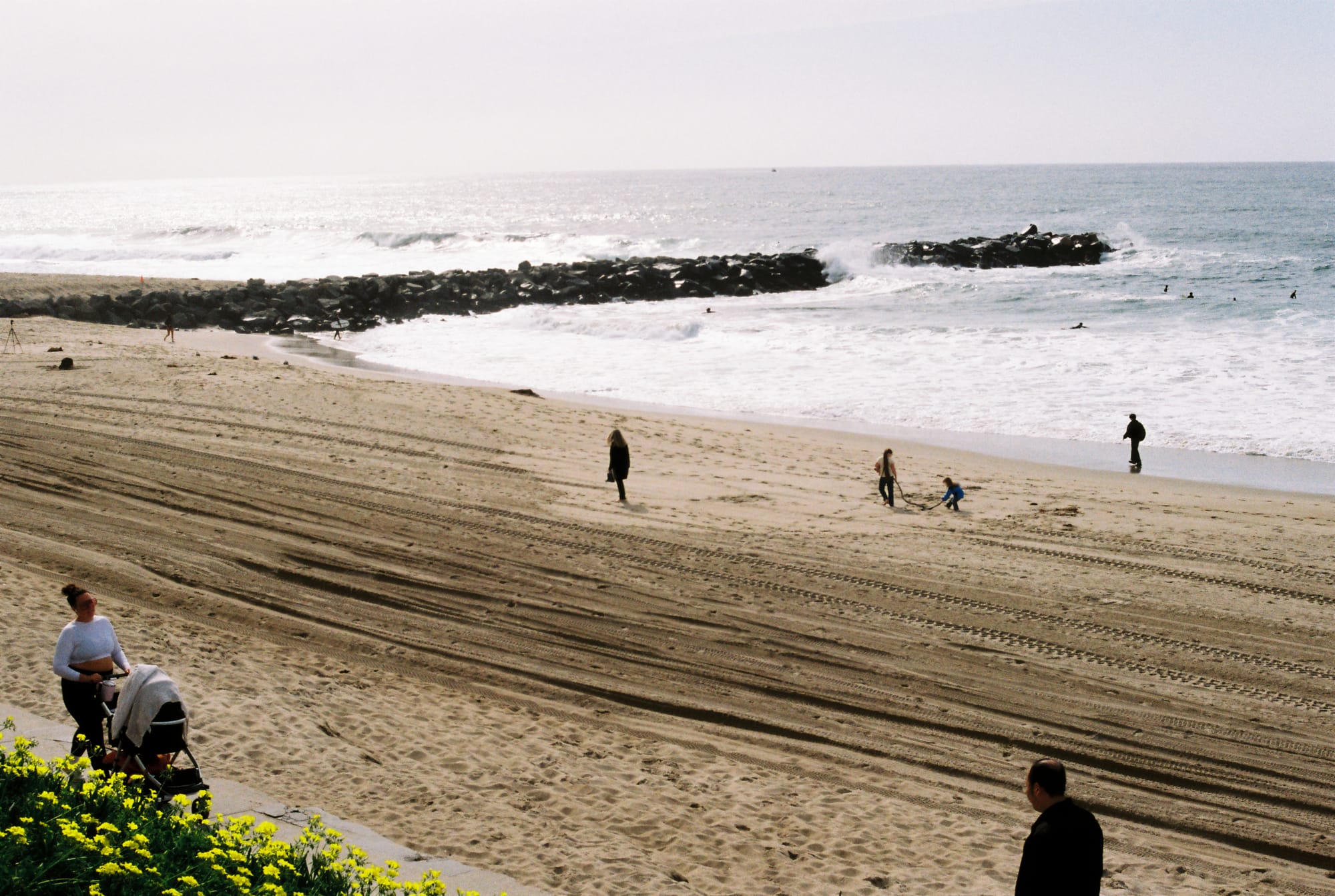 While biking by the beach, I saw this little girl dragging a stick behind her mom, who was mostly ignoring her. The moment I went to take a photo, her little sister picked up the other end of the stick to help her. Even though they were my main focus, I was far away enough that I ended up capturing various other people on the beach, who I didn't notice until I got the scan back.