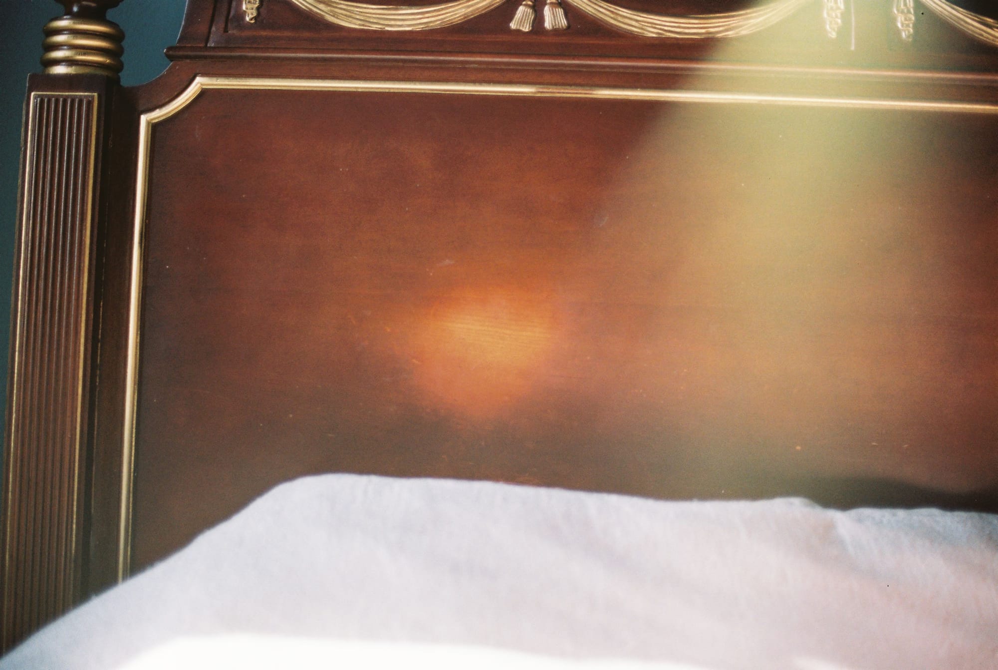 My first ever film photo! Overexposed and with a smudge that I assume is a light leak on the right side, of course. This is a picture of the bed frame in my room at my dad's house. When my dad moved houses after my mom's death, he asked me to switch bed frames with him. This is the side of the bed she used to sleep on. My dad says the finish is worn away because she used to fiddle with her wedding ring and it scraped against the wood. I always assumed it was because she sat up in bed with her hair wet.