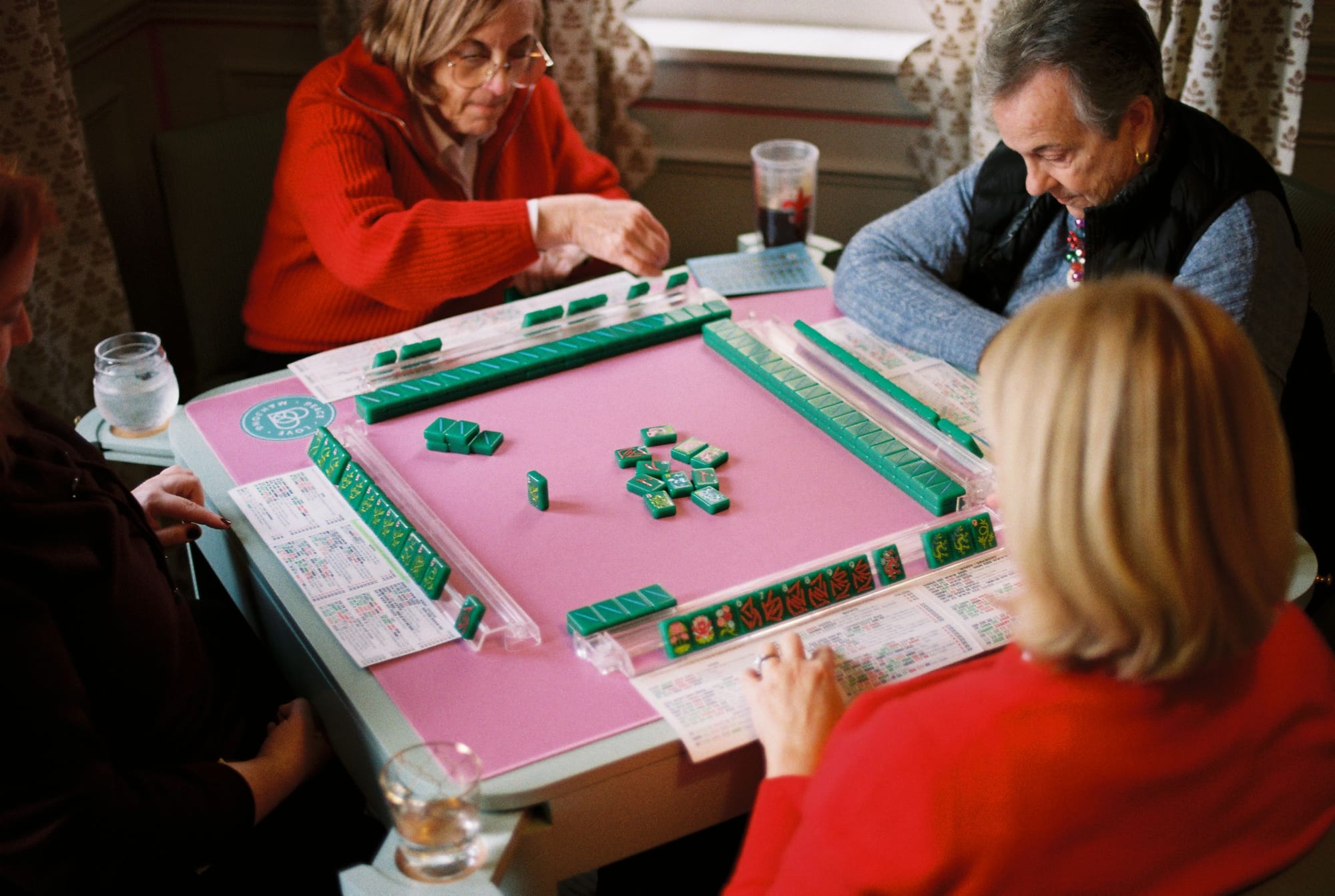 A close friend of my family decorated a whole room in pinks and greens to match this Mah Jongg set. The game has apparently become a popular pastime in her social circles. Pictured going clockwise from the lower right: My family friend, my two aunts, and my family friend's mother in law.