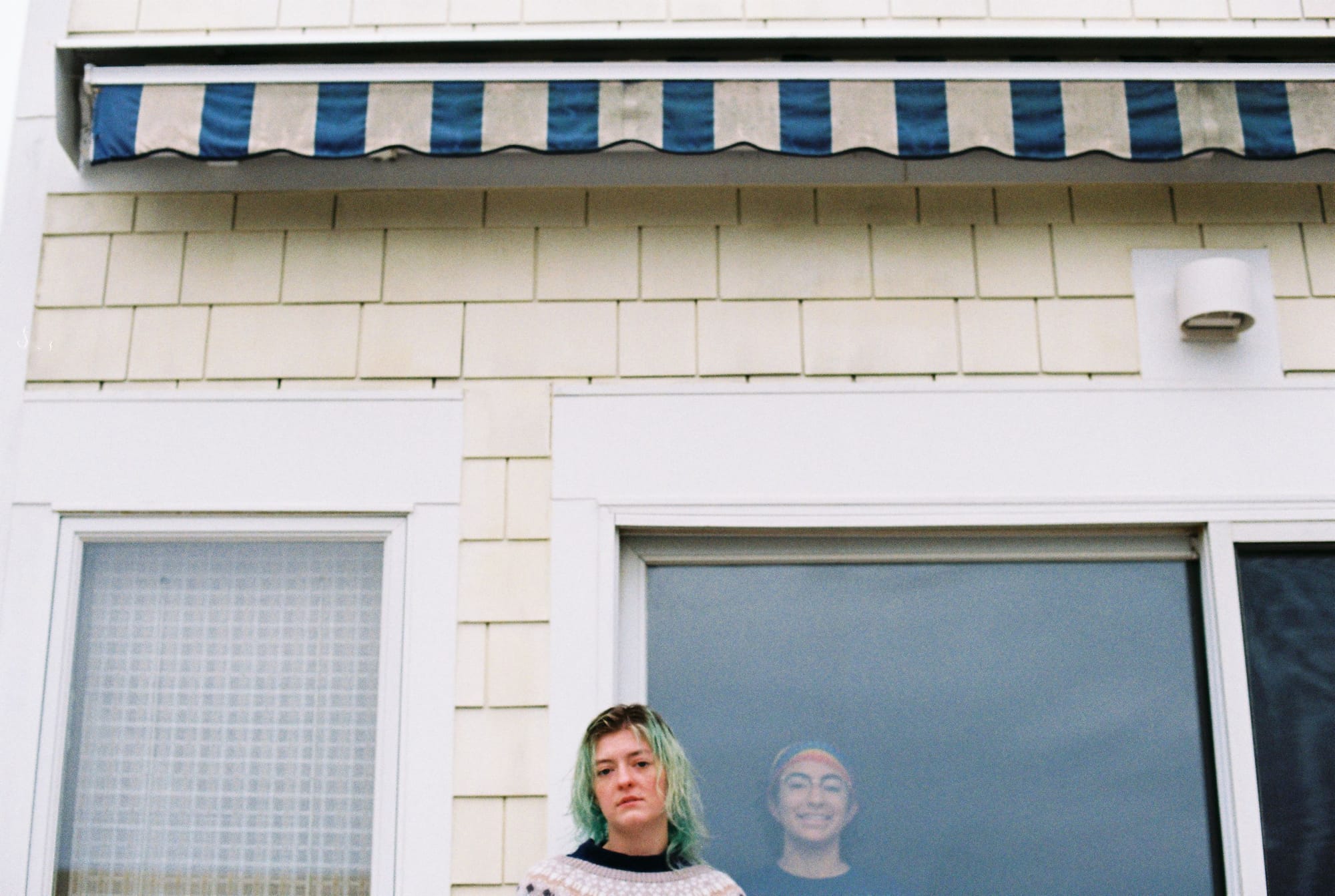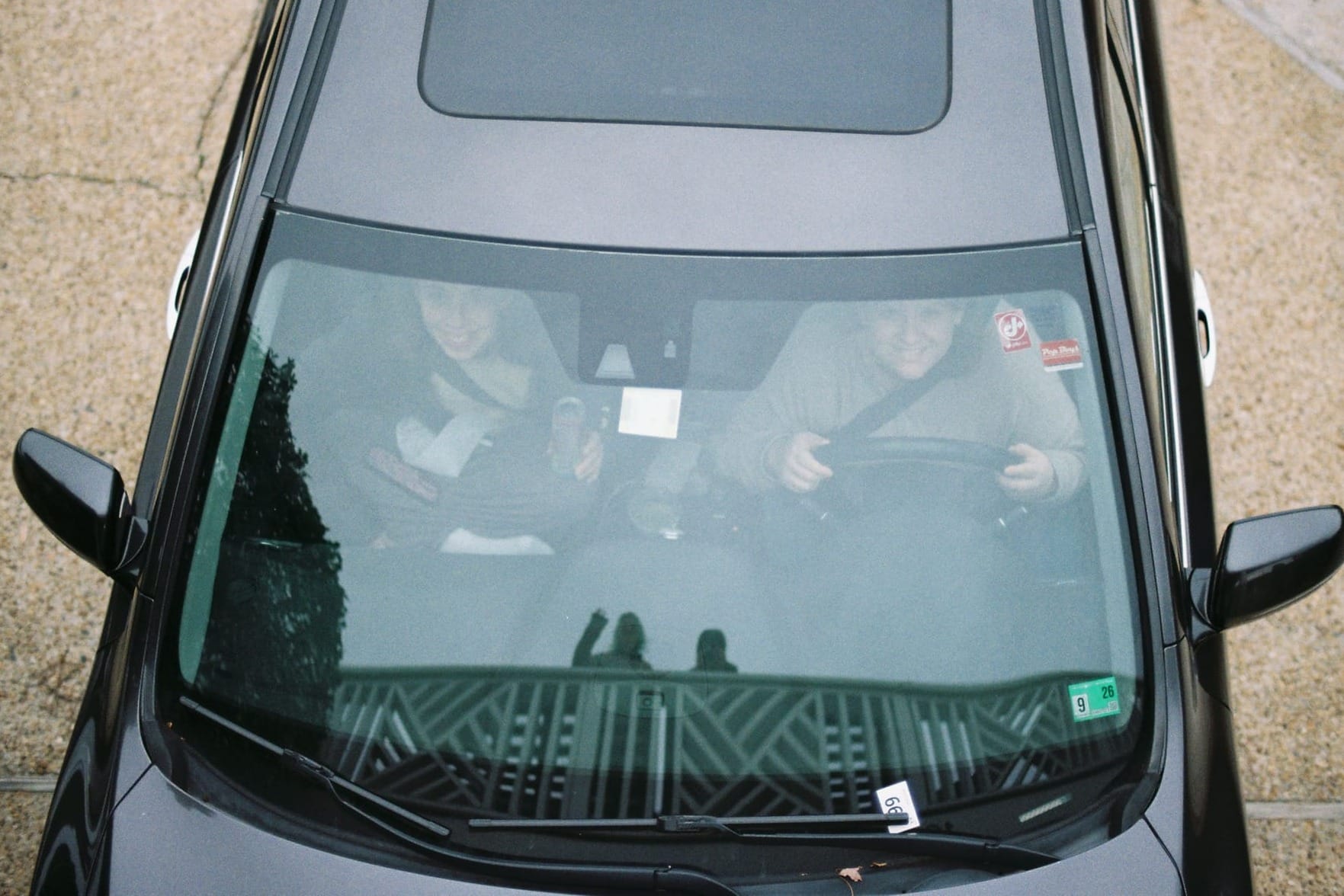 I knew that I'd be happy with this photo because of the sweet expressions on my friends' faces through the windshield (which I wish I had focused better), but it was a nice surprise when I realized how sharply film captures reflections, showing my other friend waving hello from the balcony above.
